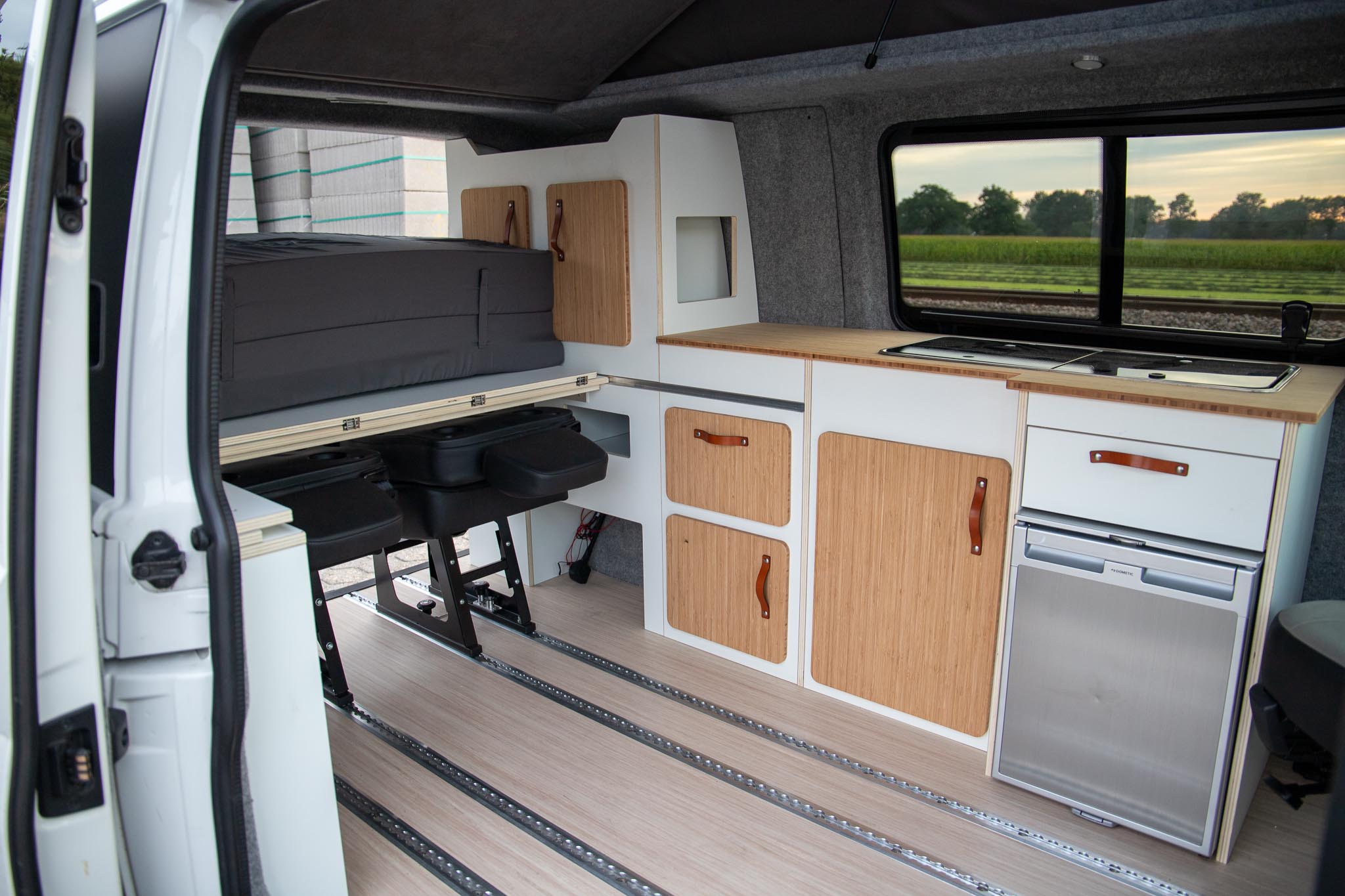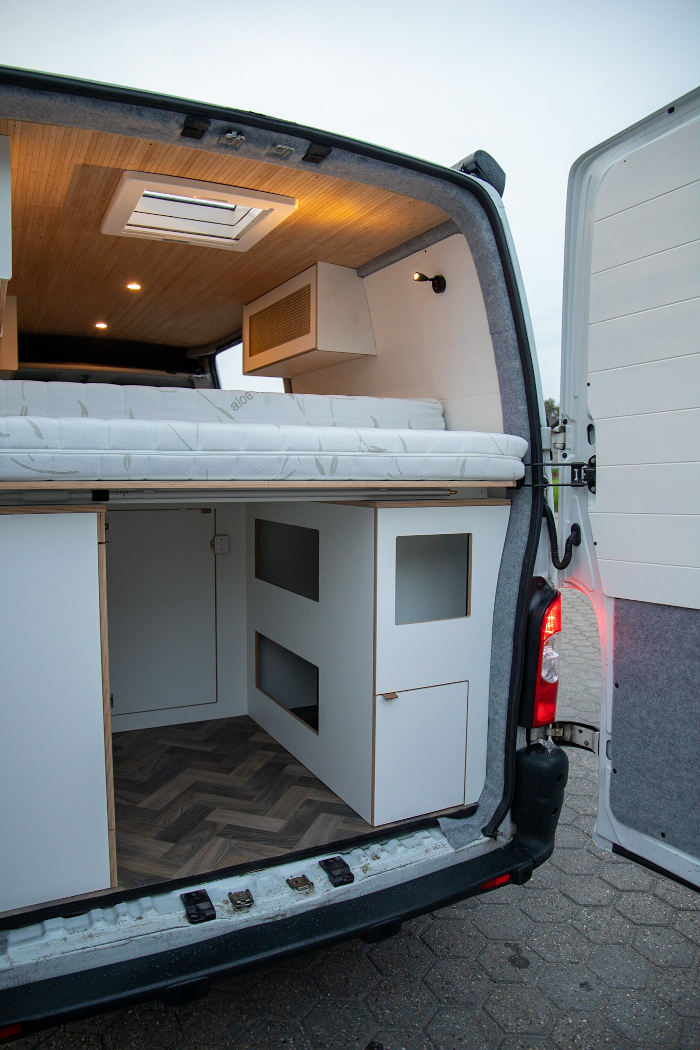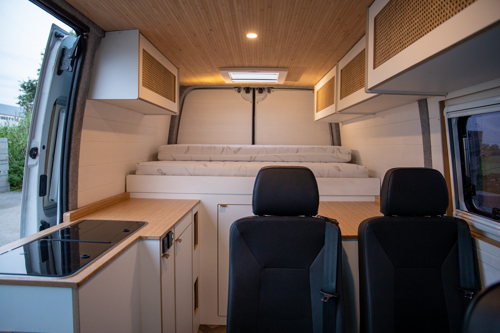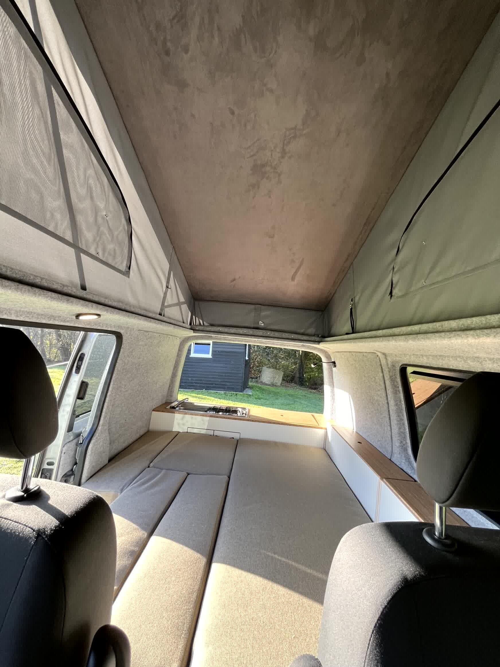 Dit interieur biedt ruimte aan 4 personen, slapen en rijden. De RDW gekeurde extra zitplaatsen zijn zelfs uit te breiden naar 6 personen (4 nu op kenteken). Twee personen kunnen boven in het hefdak slapen, en twee kunnen beneden slapen. Dit bed beneden wordt gecreëerd door het uitklappen van de bedbodem platen, steunend op de kastenwand. De extra stoelen kunnen voorover geklapt, onder het bed worden geschoven (verplaatsbaar in de rail over de volledige lengte). De stoelen en het bed kunnen in een handomdraai worden verwijderd om zo veel ruimte voor bagage en woon-werk verkeer te hebben.