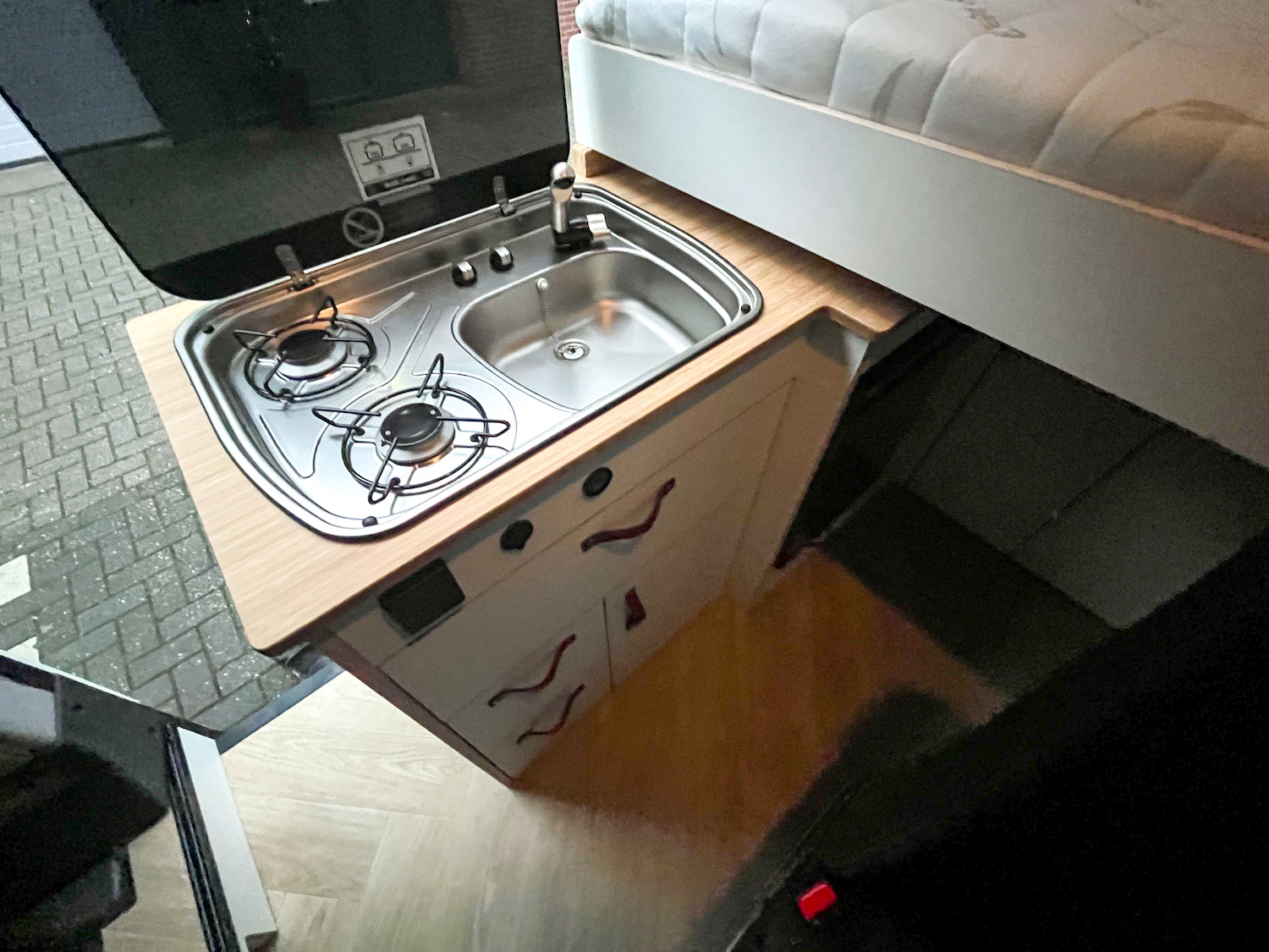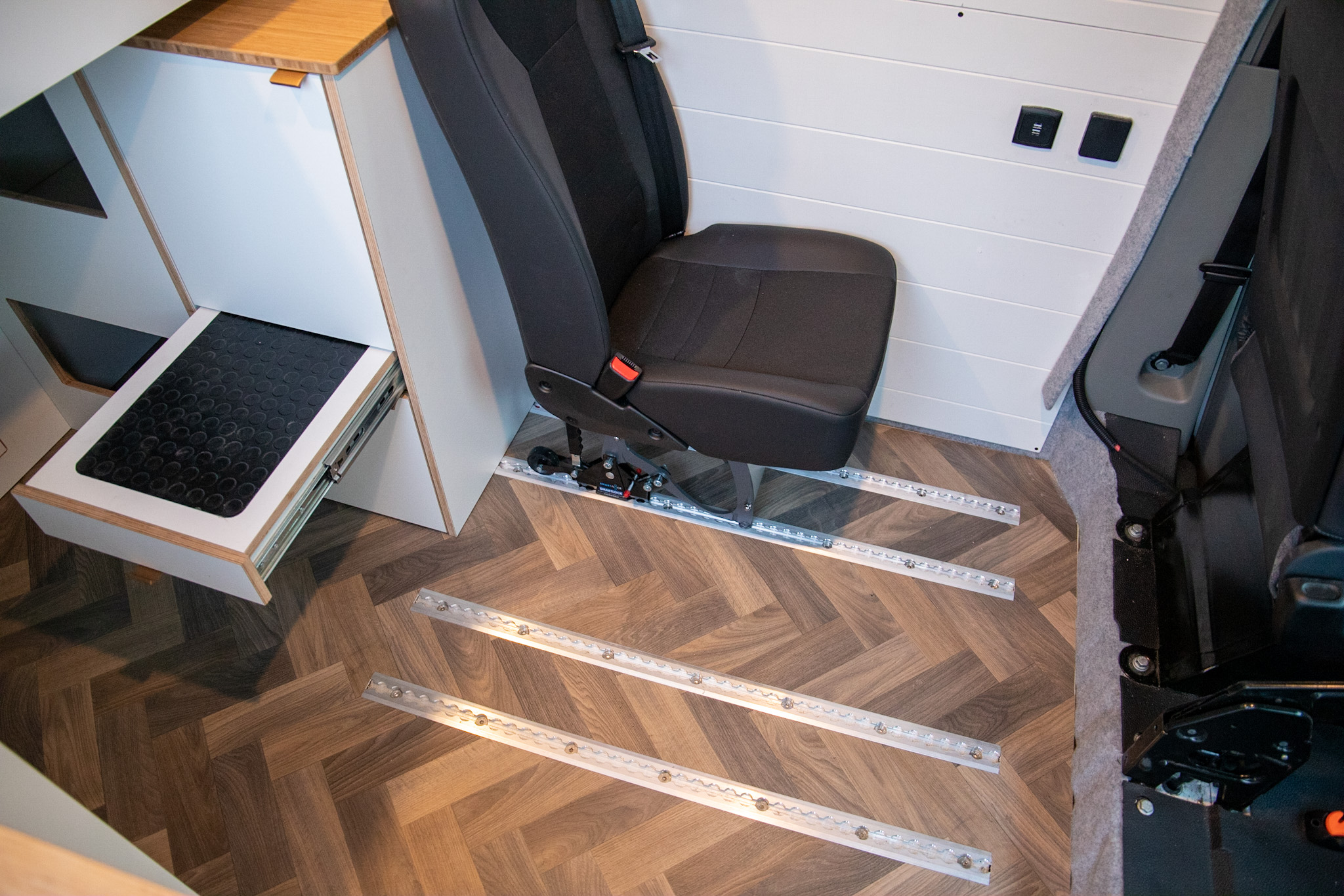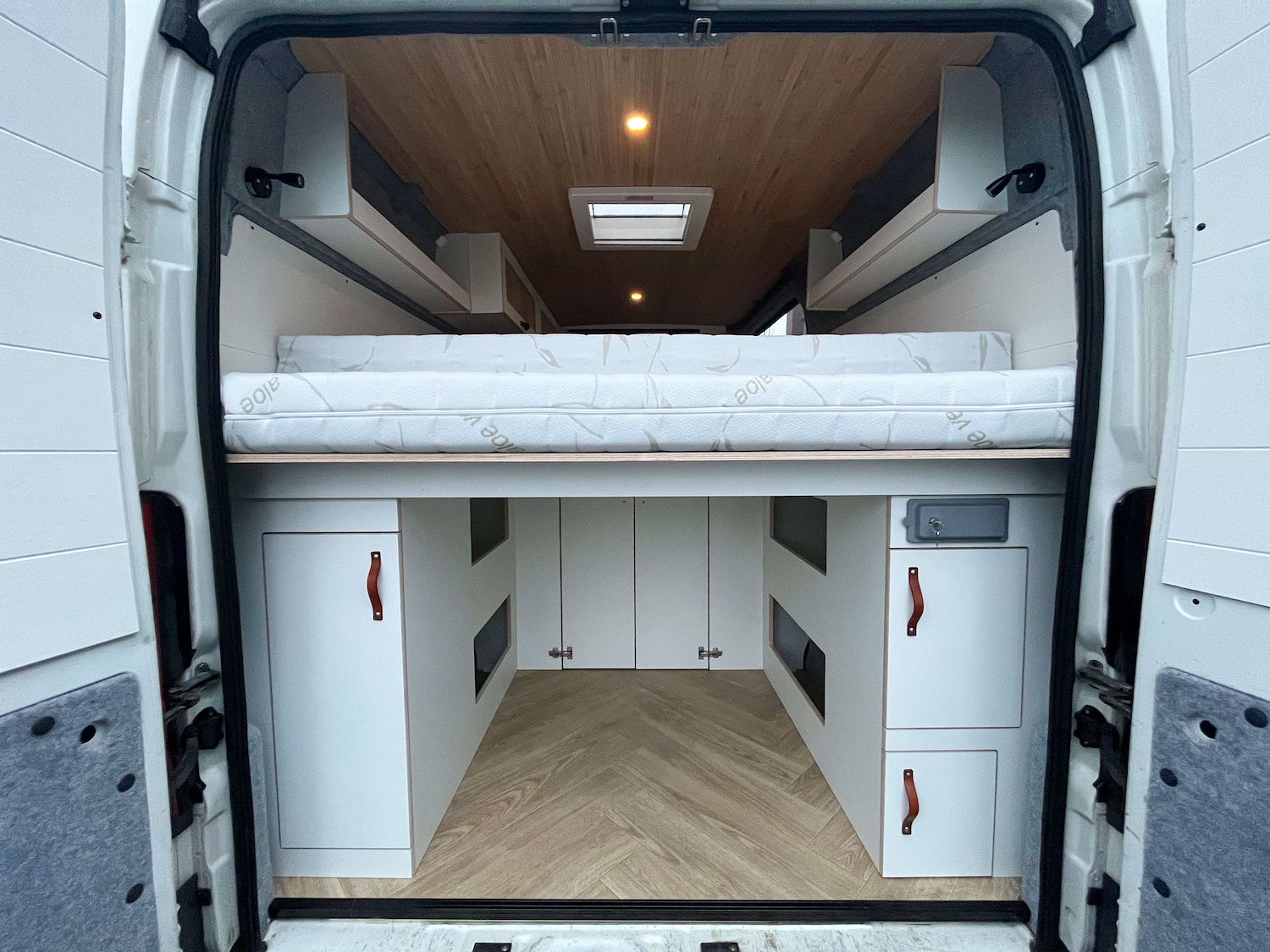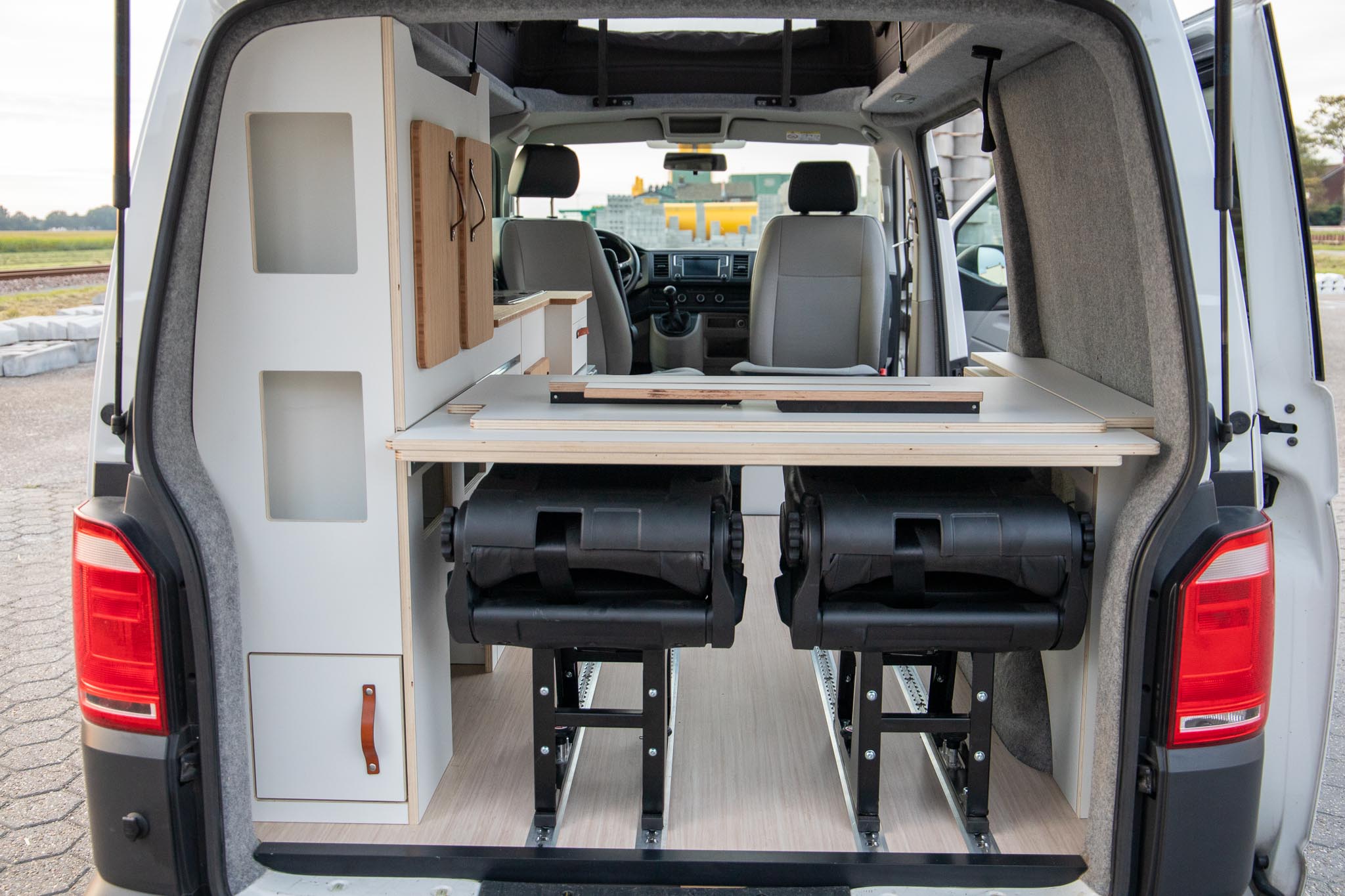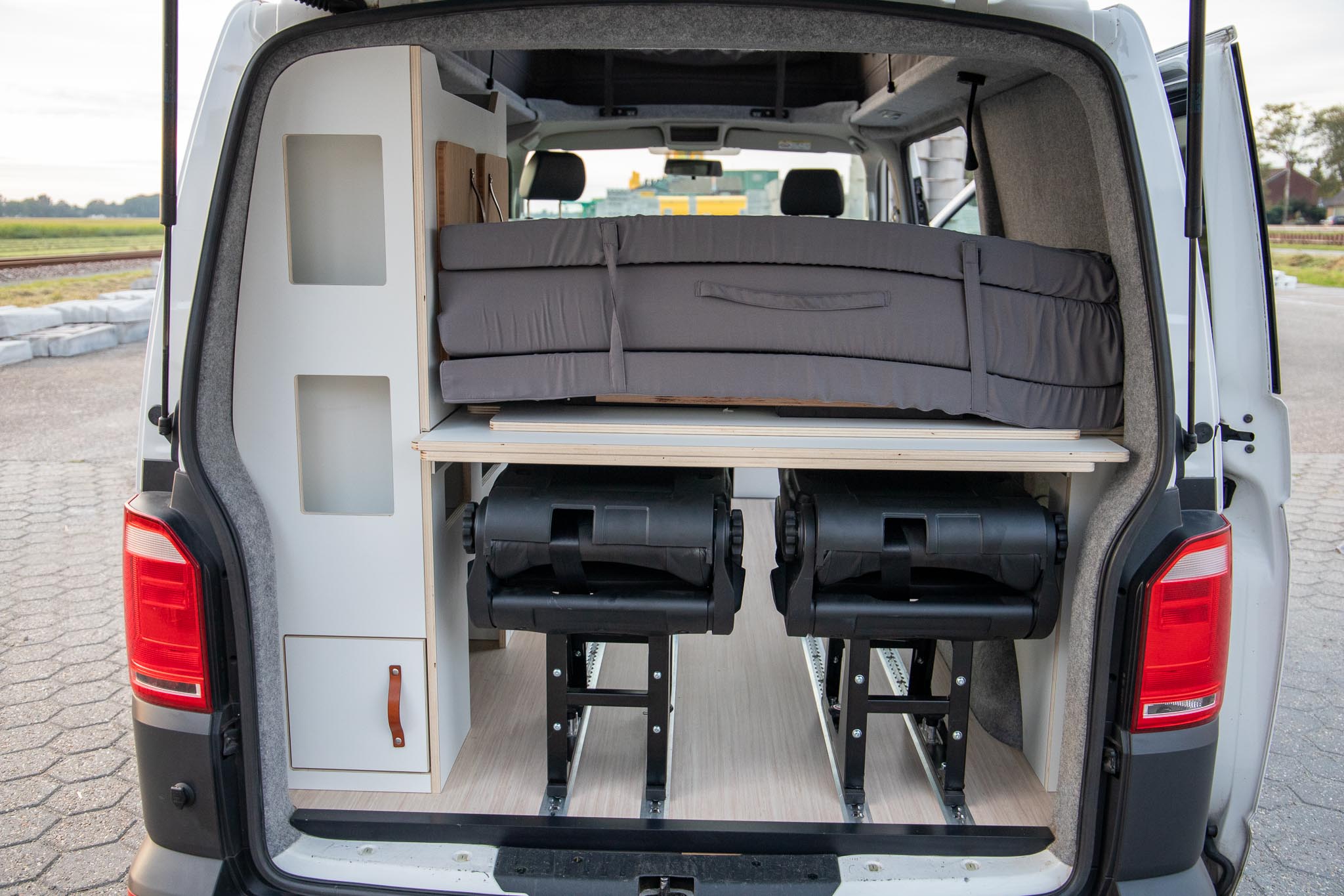 Dit interieur biedt ruimte aan 4 personen, slapen en rijden. De RDW gekeurde extra zitplaatsen zijn zelfs uit te breiden naar 6 personen (4 nu op kenteken). Twee personen kunnen boven in het hefdak slapen, en twee kunnen beneden slapen. Dit bed beneden wordt gecreëerd door het uitklappen van de bedbodem platen, steunend op de kastenwand. De extra stoelen kunnen voorover geklapt, onder het bed worden geschoven (verplaatsbaar in de rail over de volledige lengte). De stoelen en het bed kunnen in een handomdraai worden verwijderd om zo veel ruimte voor bagage en woon-werk verkeer te hebben.