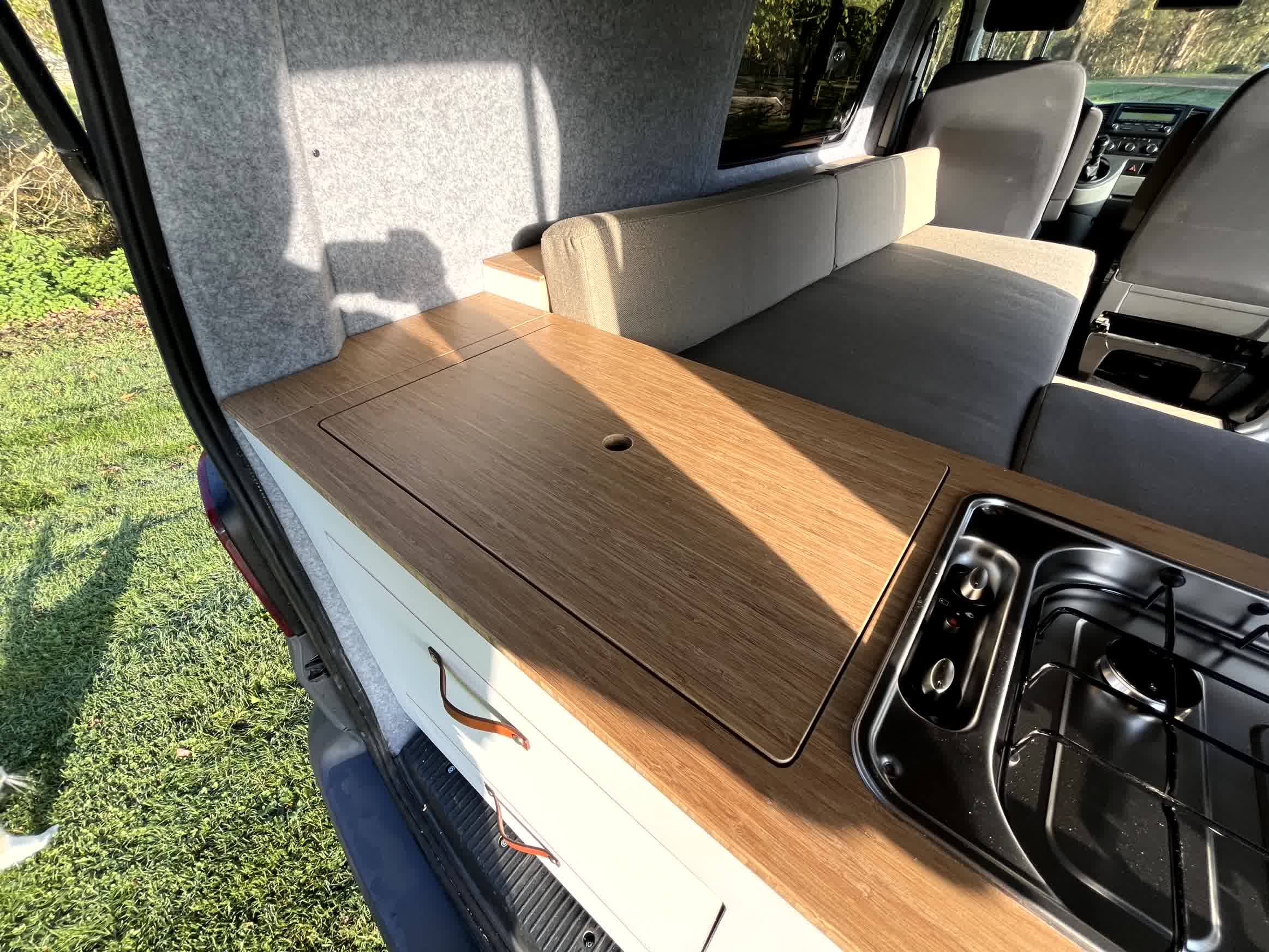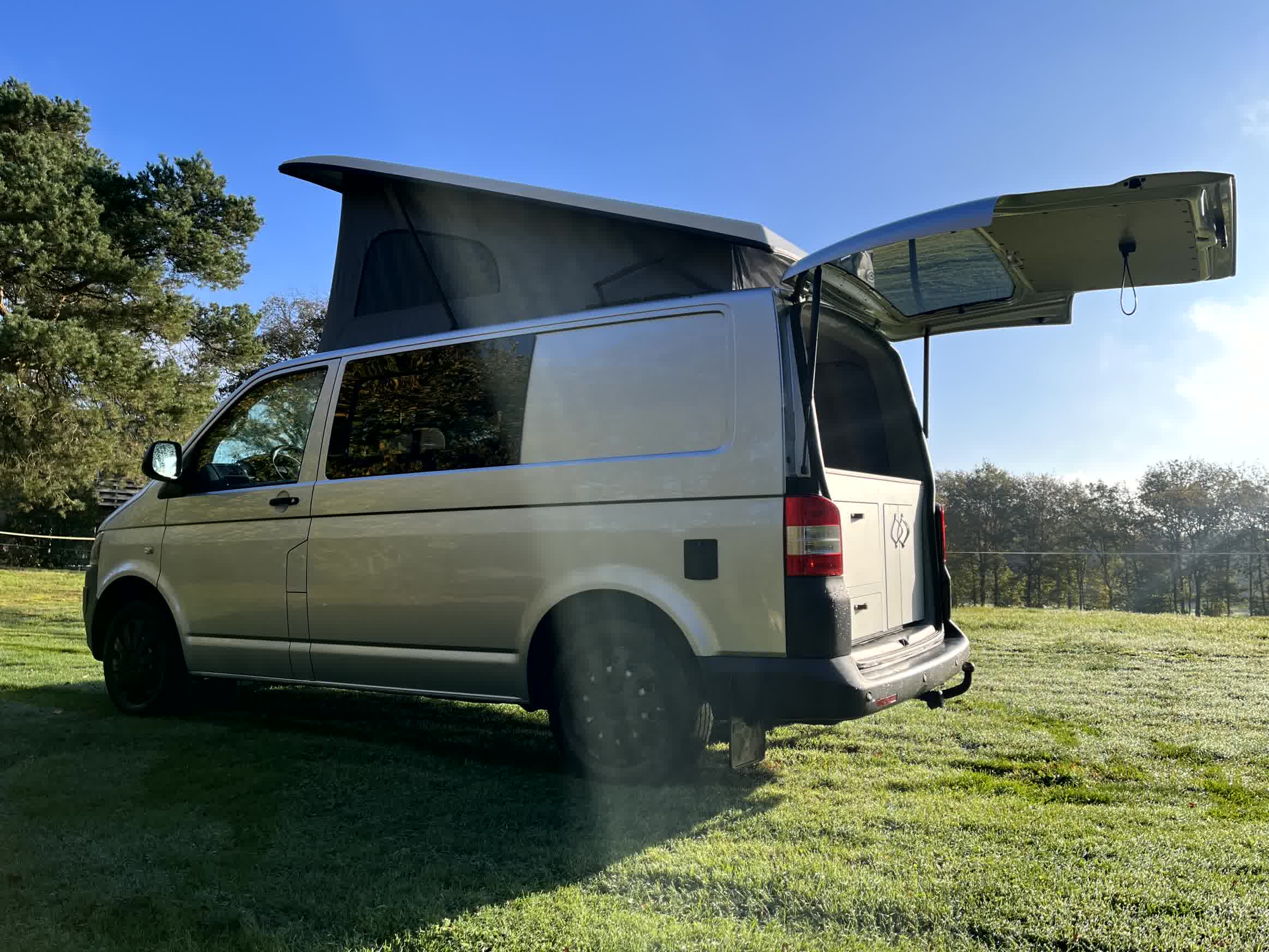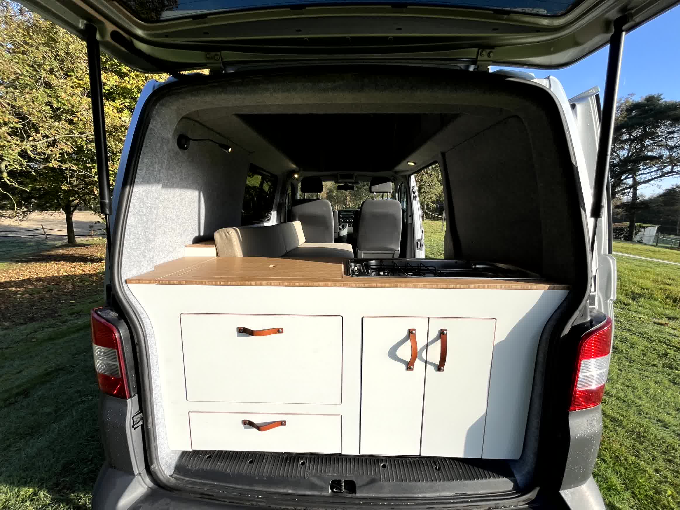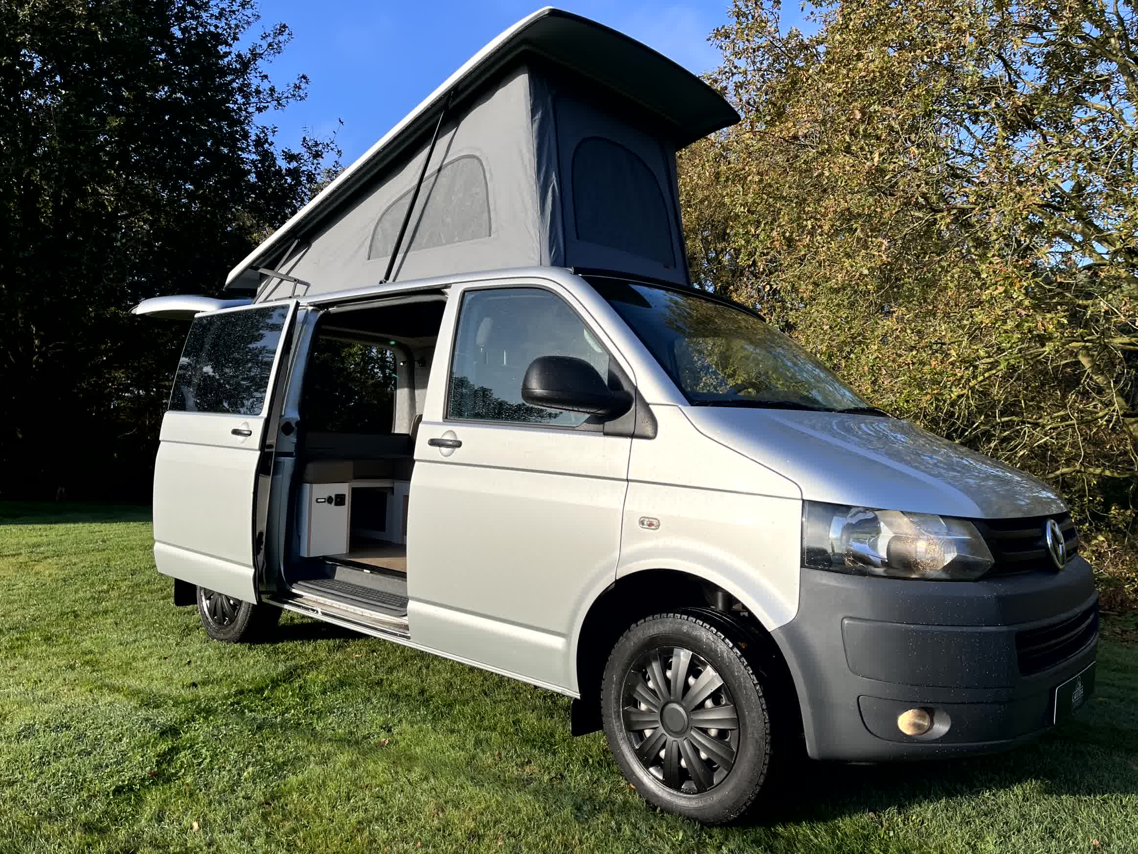 Volkswagen Transporter T5, zilvergrijs, bouwjaar 2010 – km stand 124k. Dit interieur heeft een unieke indeling met de keuken aan de achterzijde, zodat je veel ruimte binnen overhoudt voor voor een fijne zitplek, die tevens makkelijk kan worden omgebouwd tot 2 persoons bed. 2 personen op kenteken en 2 personen slapen. Het hefdak is van de beste kwaliteit (met mogelijkheid tot plaatsing van bed zodat je met 4 personen er in kunt slapen). En de bus is en blijft prettig wendbaar voor dagelijks woon-werk verkeer in verband met zijn korte lengte L1.