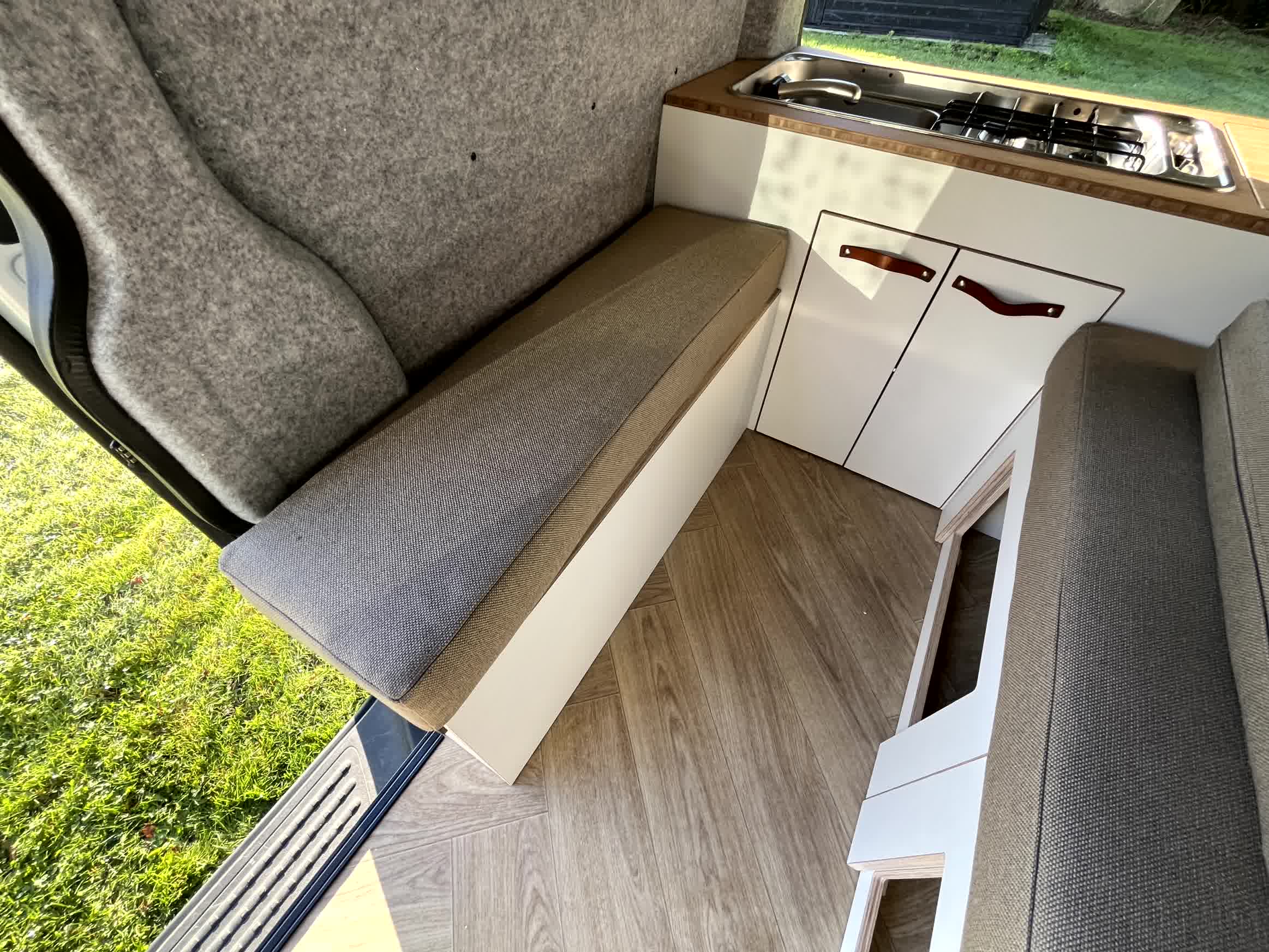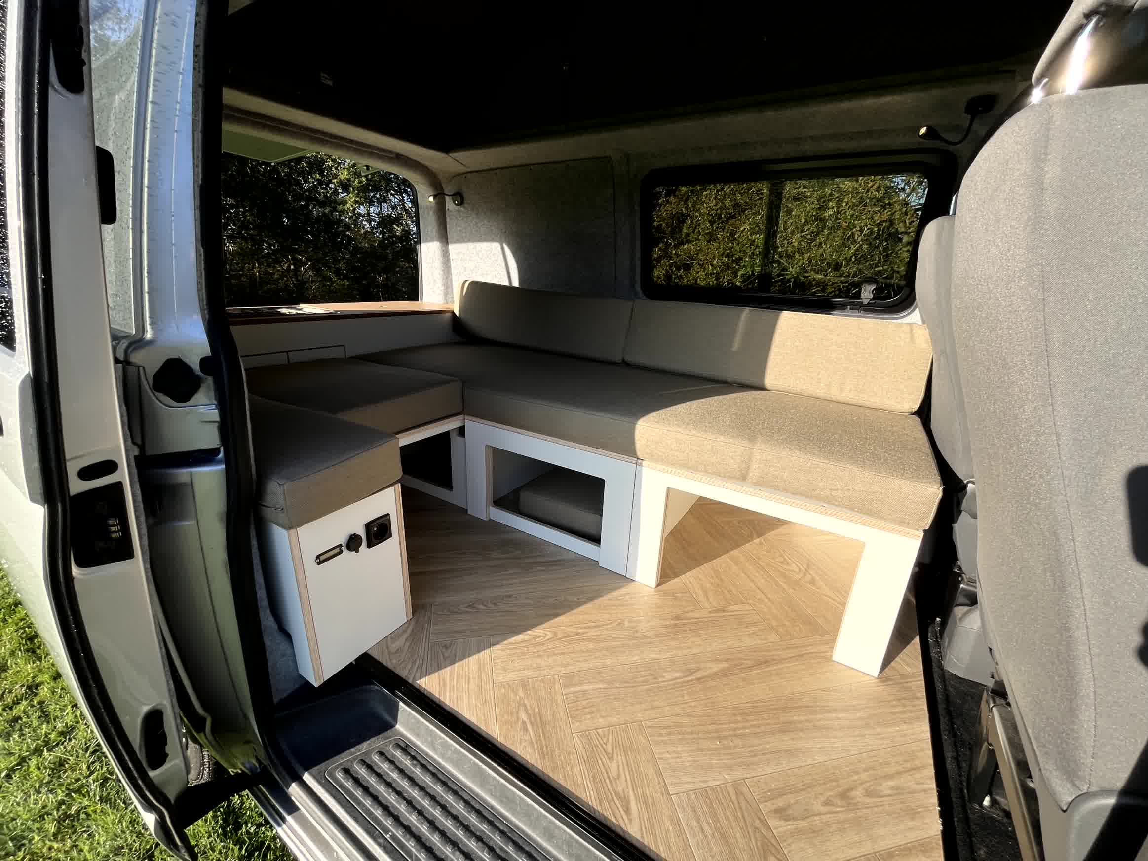 Dit interieur biedt ruimte aan 5 zitplaatsen met gordel! De RDW gekeurde extra zitplaatsen zijn makkelijk uitneembaar. Het slimme uitschuifbed geeft overdag veel leefruimte, en is s nachts een volwaardig bed van 180cm breed (!) en 190cm lang. De natuurlijke producten geven een rustige uitstraling, en de L2 lengte maakt parkeren makkelijk waardoor het ook voor woon-werk verkeer interssant is.